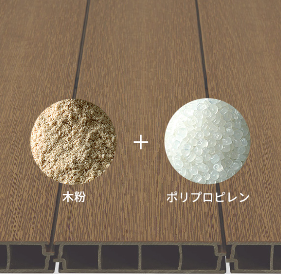 「リウッド」は、木粉と高硬度なポリプロピレンを配合した再生木です。