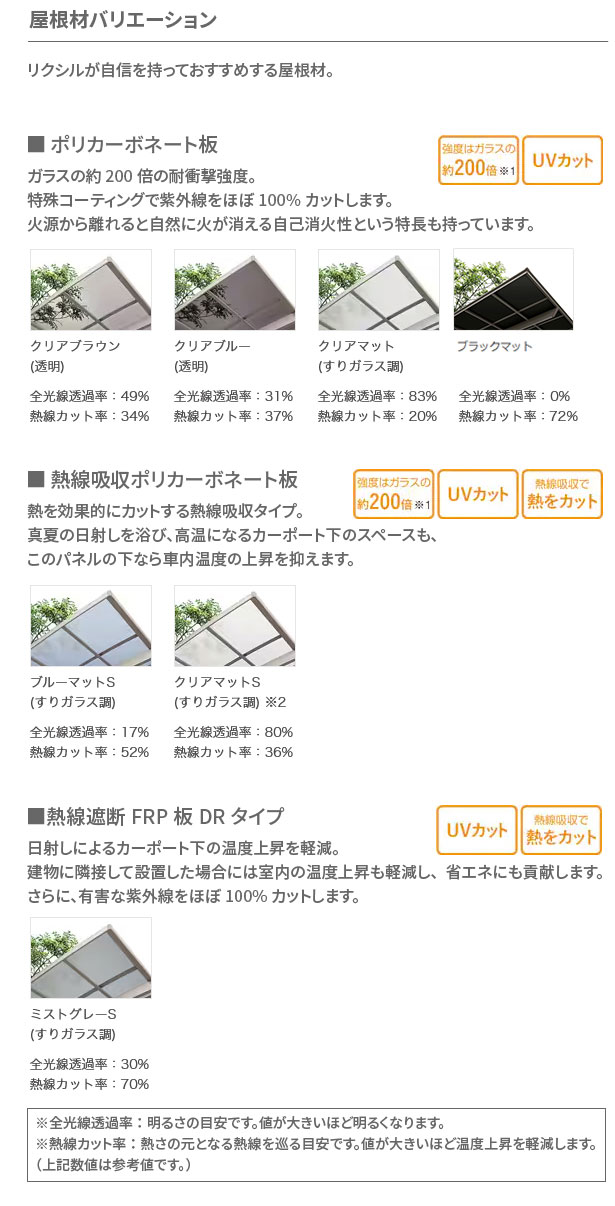 - ポリカーボネート(クリアブルー) / ポリカーボネート(クリアブラウン) / ポリカーボネート(クリアマット) / ポリカーボネート(ブラックマット) / 熱線吸収ポリカーボネート(ブルーマットS) / 熱線吸収ポリカーボネート(クリアマットS) / 熱線遮断FRP板DRタイプ(ミストグレーS)