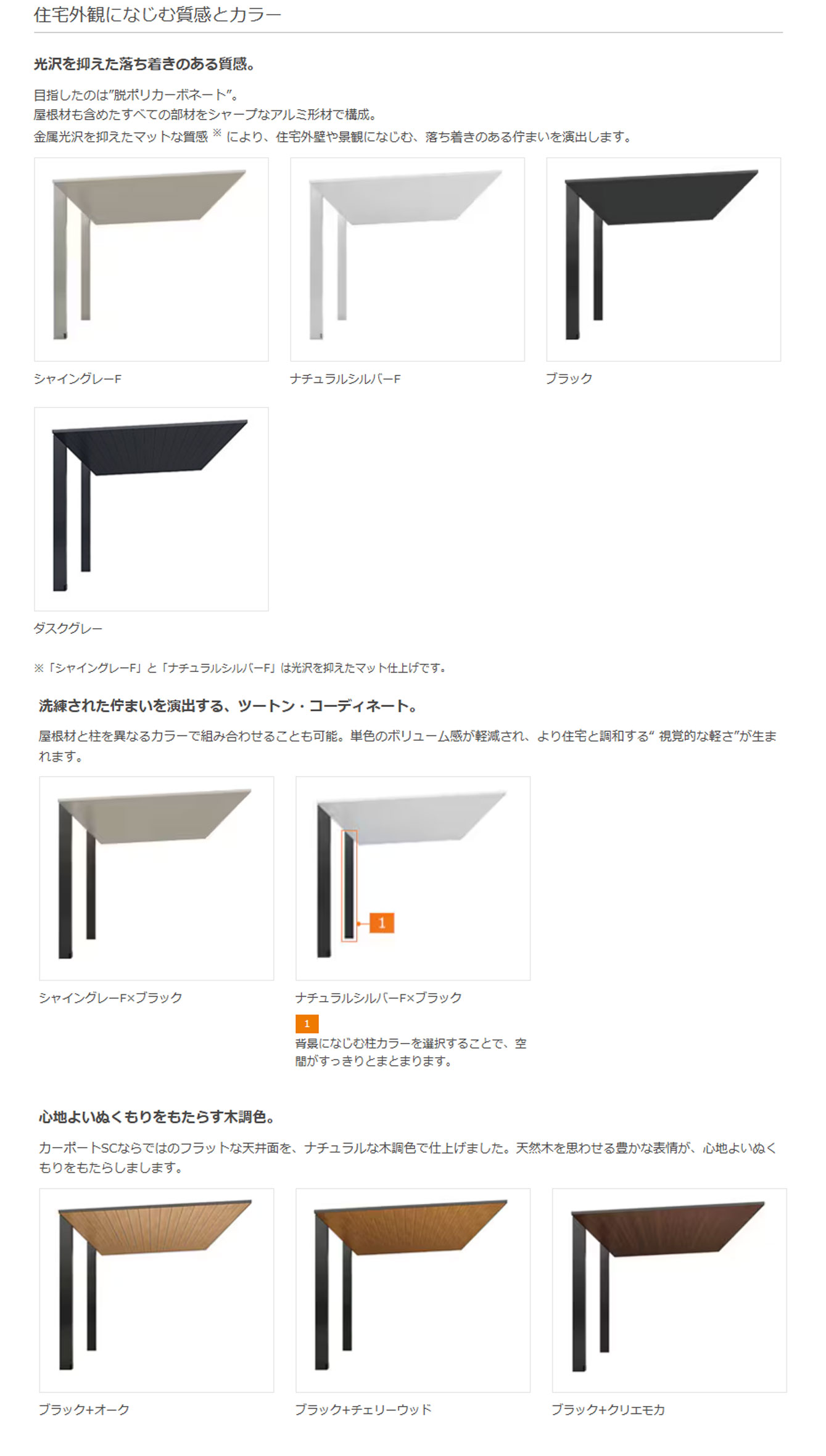 本体(柱)のカラーと屋根材は、住まいの外観やお好みに合わせてお選びください。